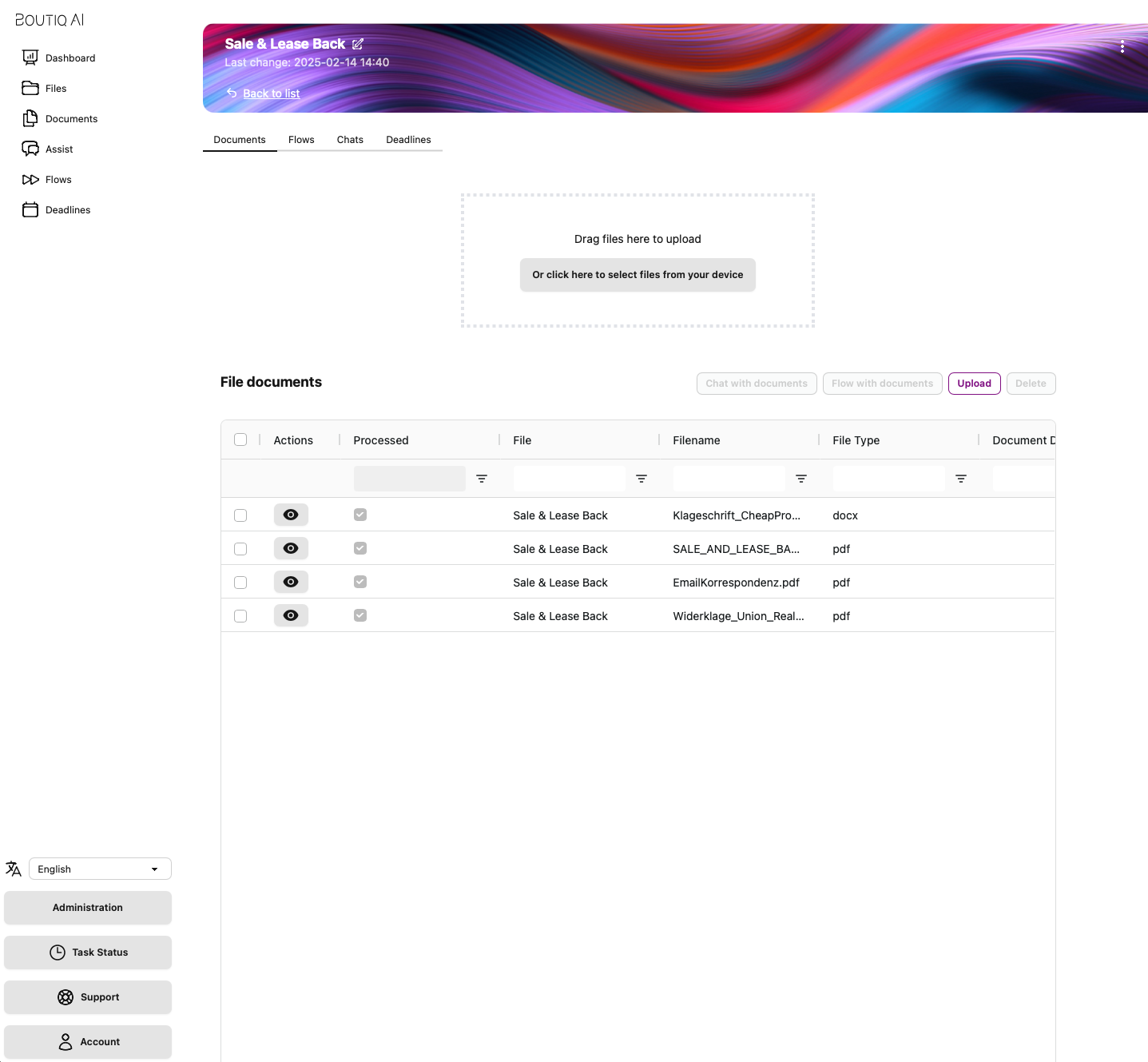 Boutiq AI verarbeitet eingehende Informationen, speichert Dokumente in einer übersichtlichen Datenbank, führt Analysen und Berechnungen durch und generiert automatisch Schriftsätze oder Verträge.